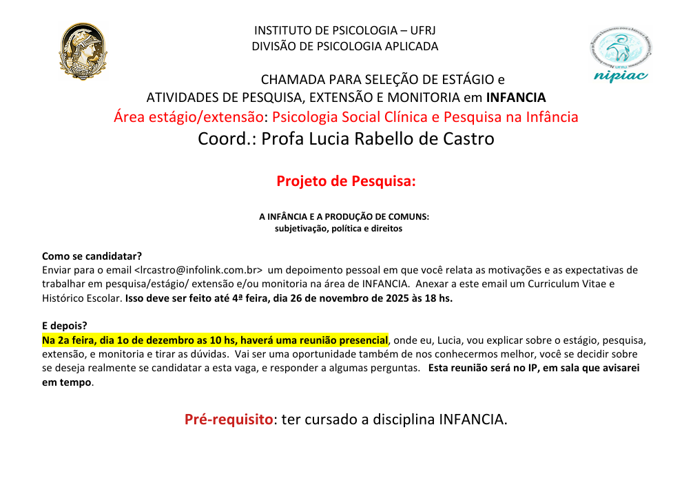 > As vagas de estágio destinam-se exclusivamente aos alunos do Instituto de Psicologia da UFRJ